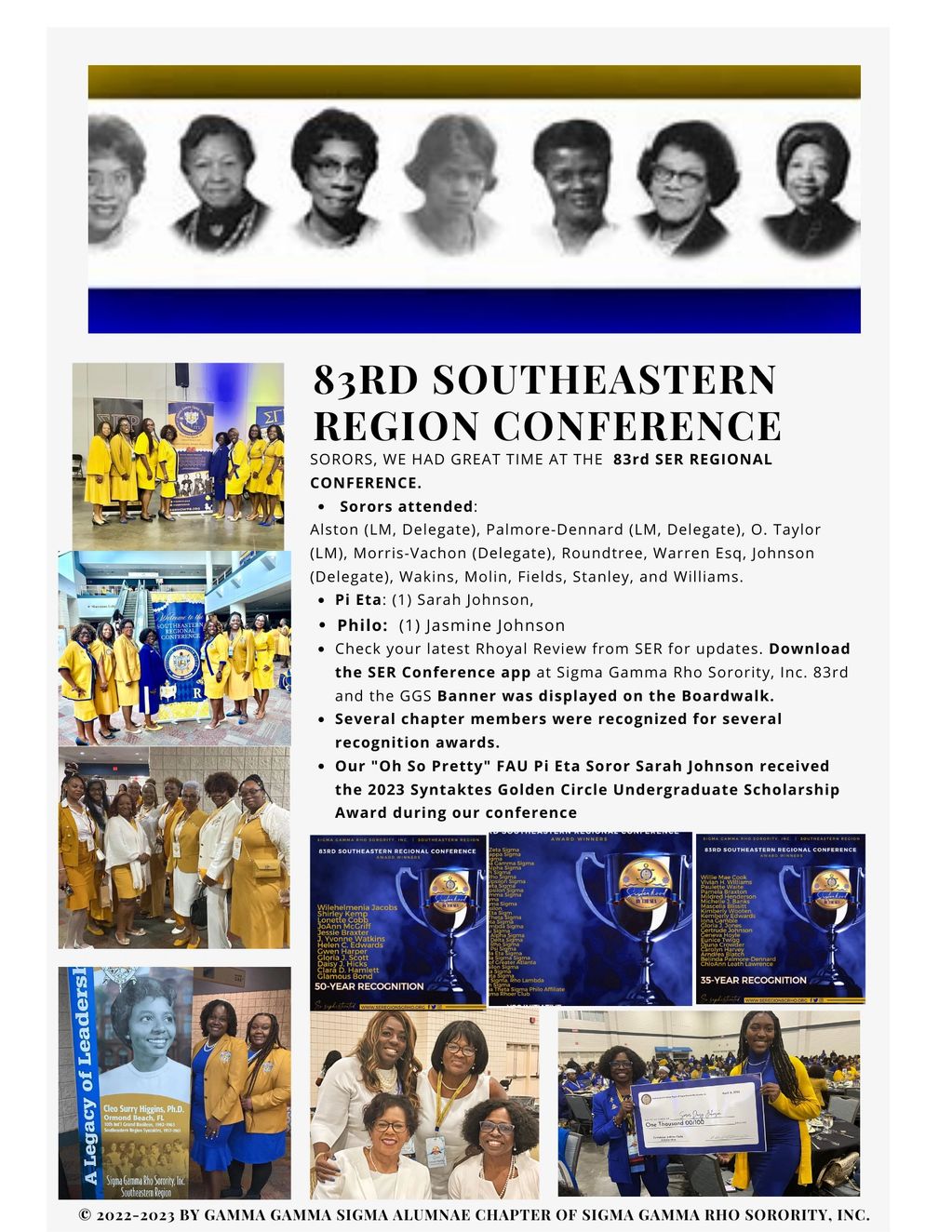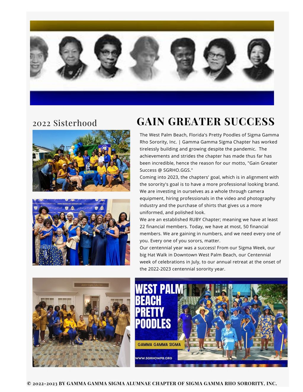 As Founder’Mary Lou Allison Gardner Little, Dorothy Hanley Whiteside, Vivian Irene White Marbury, Nannie Mae Gahn Johnson, Hattie Mae Annette Dulin Redford, Bessie Mae Downey Rhodes Martin, and Cubena McClure forged a path for greatness, their vision has served as a lasting mission for Sigma Gamma Rho Sorority.